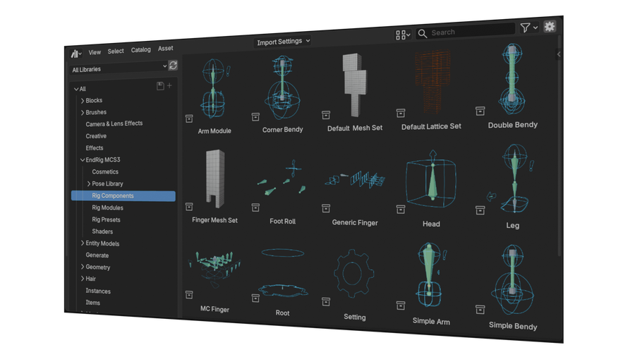 The MCS release introduces a modular rigging system, allowing rigs to be assembled from individual components for nearly any model. These components include biped arms and legs with IK-FK, fingers, torso, head, facial features, root, and more.
